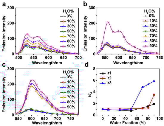 The emission spectra of Ir1 (a), Ir2 (b), and Ir3 (c) at 10 μM in H2O/CH3CN with different H2O fractions (0–90% v/v). (d) The relationship between the relative intensity of Ir1–Ir3 at the maximal emission wavelength and distinct water fractions. The excitation wavelengths of Ir1, Ir2, and Ir3 were 400 nm, 400 nm, and 440 nm, respectively.