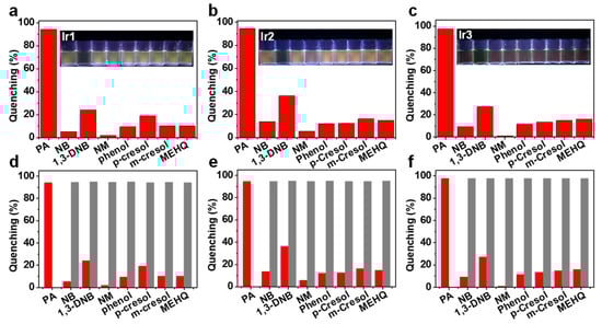 Based on the sensitive detection properties of Ir(III) complexes Ir1–Ir3 for PA, the sensing selectivity of these Ir(III) complexes was also conducted in H2O/CH3CN (v/v = 9:1, 10 μM). The phosphorescent emission quenching experiments for nitroaromatic and non-nitroaromatic compounds were studied, including picric acid (PA), nitromethane (NM), nitrobenzene (NB), and m-dinitrobenzene (1,3-DNB), as well as non-nitroaromatic compounds such as phenol, m-cresol, p-cresol, as well as 4-methoxyphenol (MEHQ). Compared with PA, all other analytes exhibited less of an effect on luminescence quenching under the same conditions (Figure 4a–c and Figure S4), which can also be confirmed from the corresponding photos under a UV lamp at 365 nm (Figure 4a–c, inset). This might be because PA is a representative electron-deficient compound with three electron-withdrawing nitro groups. Ir(III) complexes Ir1–Ir3 as electron donors can cause the photo-induced electron transfer (PET) for the emission quenching of Ir1–Ir3 [38]. The results of selectivity experiments reveal that the Ir(III) complexes Ir1–Ir3 have significantly high luminescent quenching efficiencies and selectivity for PA detection.