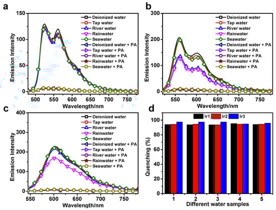 Anti-interference ability is another essential requirement for a suitable sensing probe. Thus, the influence of other potentially competitive analytes on PA detection was evaluated. As shown in Figure 4d–f and Figure S4, in the presence of other potential competitive analytes, PA can still significantly quench the emission of Ir(III) complexes Ir1–Ir3 in H2O/CH3CN (v/v = 9:1, 10 μM). These results demonstrate that Ir(III) complexes Ir1–Ir3 have an excellent anti-interference ability toward PA detection over other analytes. Additionally, to assess the actual uses of Ir(III) complexes Ir1–Ir3, their luminescent responses for PA were evaluated in natural water samples made by tap water, river water, rainwater, and seawater. As shown in Figure 5a–c, the luminescence of Ir(III) complexes Ir1–Ir3 is also quenched by PA in different samples of water/acetonitrile (v/v = 9:1). Additionally, the luminescence spectra of PA detected in the actual water samples do not change shape any more compared with those in deionized water. As can be seen from Figure 5d, there is little difference in the quenching efficiency among different water samples. For example, the quenching efficiencies of Ir3 in tap water, river water, rainwater, and seawater were calculated to be 97%, 97%, 95%, and 96%, respectively, which are similar to those in deionized water. The results indicate that these Ir(III) complexes work well in natural water samples.