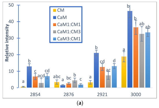 | CaM3:CM1 | 6.48 ± 0.02 ab | 31.26 ± 0.04 b | 30.64 ± 0.03 b | 51.14 ± 0.05 c | 121.27 ± 0.05 b | −561.55 ± 0.06 d |