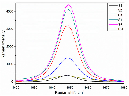 To quantify the SERS activity of the different samples, the enhancement factor was calculated from the intensity of the peak at ~1650 cm−1, marked in red in Figure 5, based on the formula given in Section 2. The EF values are listed in Table 4.