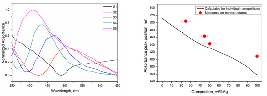 The optical properties of the different samples were characterized by measuring their absorbance. Figure 4 shows the normalized absorbance spectra of S1-S5, which exhibit the blueshift of the absorbance peak position with increasing silver content. By comparing the experimental results with the values calculated (Calculations were made by using the MiePlot computer program, available at www.philiplaven.com/mieplot.htm (accessed on 3 March 2023)) for individual spherical nanoparticles in the relevant composition and size range, one can conclude that the measured values follow the theoretical trend reasonably well. However, the peak positions measured on the nanostructure layers are consistently larger than those of the individual nanoparticles, which indicates coupling between the particles forming the deposited layer [56,57]. Since aggregation of the particles is apparent in Figure 3, such deviation from the theoretical trend is expected.