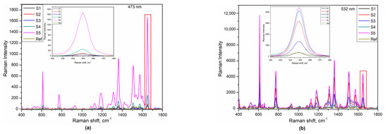 EF values of S1–S5 were calculated for the ~1650 cm−1 peak at different excitation wavelengths.