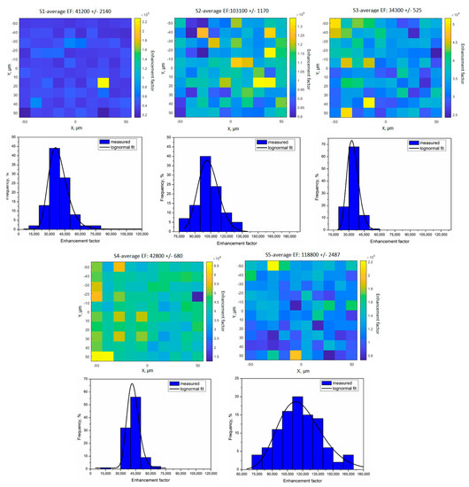 The enhancement maps of S1–S5 and the corresponding EF distributions are shown in Figure 7. It is clear from the maps and the distribution graphs that the variation of the enhancement approximately follows a log-normal distribution over the examined surface area. The average values and the standard deviation of the enhancement factor are summarized in Table 5. Relative standard deviation values are obtained in the 1–5% range, indicating that the surface enhancement of the substrates can be considered exceptionally uniform. However, it should be noted that the measured area of 100 × 100 μm2 characterizes only a small part of the active surface and by approaching the edge of the sample, where fewer and fewer nanoparticles are present, the observed distributions might change considerably. This is well reflected by the fact that enhancement factor values measured and averaged over the whole samples (having areas in the range of several mm2) somewhat differ from those obtained by mapping a smaller portion of each sample. Nevertheless, the relative standard deviations corresponding to the whole samples are still in the range of 3–21% (with an average of 9%), which indicates reasonably good uniformity.