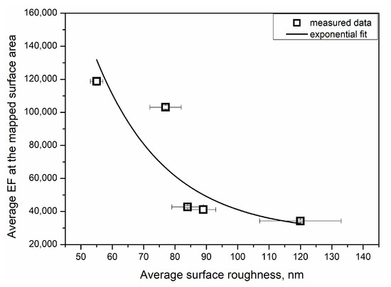 The above results reflect the dependence of the Raman enhancement factor on the material properties of the applied nanostructure. In our case, this was achieved by generating nanoparticles with different compositions in the gas phase. However, as evidenced by the morphology analysis of the samples, the deposited layers fabricated from the generated particles exhibit differences. One variable which can be used as an indicator of certain surface morphology-related differences is roughness (cf. Table 3, Figure 3), which is also known to affect the enhancement of a surface [58]. With fixed NP size, shape, and density, the average composition of an NP film has the greatest relevance to its overall applicability in various potential SERS-based applications (see e.g., the question of chemical stability and biocompatibility). Nevertheless, from a practical point of view, it is worth assessing the potential contribution of surface morphology to the overall enhancement effect, arising from the impaction-based deposition method. If we assume that in the present composition and roughness ranges the material dependence is higher than that of the roughness-dependence, the latter can be investigated by comparing the enhancement factor values obtained at optimal excitation wavelength—shown in Table 4—with the roughness of the corresponding sample. Such a comparison is shown in Figure 8, where the average enhancement of a mapped area is shown as a function of the average surface roughness. Based on this graph, it can be said that the lower the surface roughness of the substrate, the greater the enhancement. So, if we omit the material property factor arising from the different compositions by always using the optimal excitation, then EF is roughly negatively correlated with the roughness. A similar tendency has been observed for gold nanoislands exposed to increasing annealing temperatures [59]. This effect is particularly pronounced below a roughness of ca. 80–90 nm, above which the enhancement factor seems to be fairly constant.