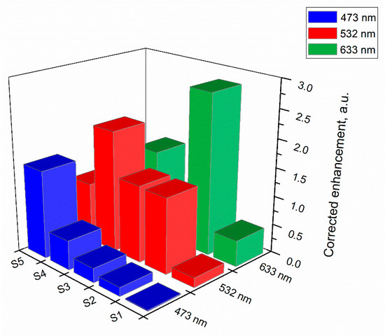 As can be seen in Table 4, the enhancement factor of the samples varies approximately in the 103–105 range, depending on the properties of the nanostructure and the excitation wavelength. The highest enhancement (ca. 2 × 105) can be achieved either by S5 with 473 nm or by S2 with 633 nm excitation wavelength.