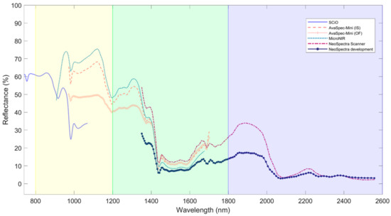 Figure 1 shows the average spectra of granulated sugar collected with the five spectrometers and the two configurations for the AvaSpec-Mini. The different wavelength ranges are also represented. While benchtop instruments typically cover the entire range represented (800–2500 nm) [33,34,35], miniaturized spectrometers typically cover narrower ranges. When dealing with miniaturized sensors, the specific range of acquisition may influence analysis in different ways and careful evaluations need to be pursued for the application of interest. In addition to this, the technological development of different manufacturers should be intended for different scopes, for instance, use in the field or online implementation. With respect to the color [36,37] SCiO works in a spectral range that reaches the visible part of the electromagnetic spectrum, adding information that may not be of interest.