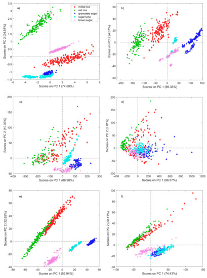 PCA results on mean-centered data: score plot for (a) SCiO, (b) Viavi Micro-NIR, (c) AvaSpec with integrating sphere, (d) AvaSpec with optical fiber, (e) NeoSpectra Scanner, and (f) NeoSpectra Development kit.