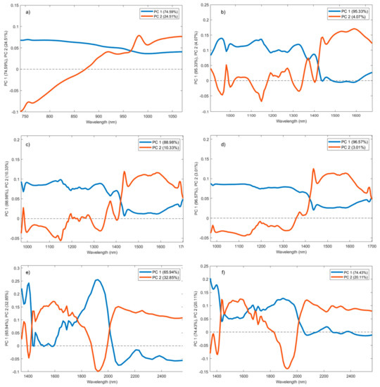 PCA results on mean−centered data: loading plot for (a) SCiO, (b) Viavi Micro−NIR, (c) AvaSpec with integrating sphere, (d) AvaSpec with optical fiber, (e) NeoSpectra Scanner, and (f) NeoSpectra Development kit.