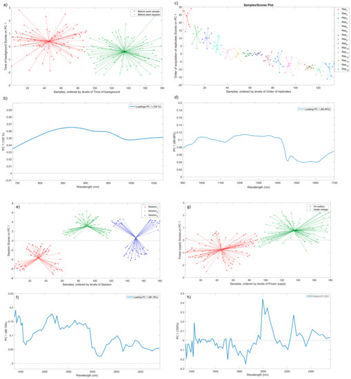 ASCA sub−models of raw data. Scores (a) and loadings (b) of the ASCA sub−model for the factor timing of background. Instrument: SCiO. Sample: red rice. Scores (c) and loadings (d) of the ASCA sub−model for the factor order of replicates. Instrument: MicroNir. Sample: brown sugar. Scores (e) and loadings (f) of the ASCA sub−model for the factor session. Instrument: NeoSpectra Scanner. Sample: sugar lumps. Scores (g) and loadings (h) of the ASCA sub−model for the factor power supply. Instrument: NeoSpectra Scanner. Sample: granulated sugar.