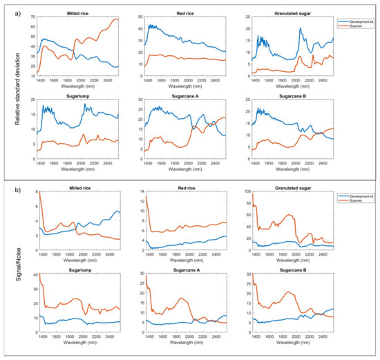 Relative standard deviation (a) and signal to noise ratio (b) for the spectra of all samples: results for spectra acquired with NeoSpectra scanner are in orange, while results for the spectra of NeoSpectra development kit are represented in blue.