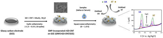 In this study, we introduce a sensitive non-enzymatic electrochemical detection of UA and XT utilizing 3D macroporous GNP/rGO-CNT/GCE fabricated by a one-step electrochemical deposition and co-reduction method. The prepared GNP/rGO-CNT/GCE showed good electrocatalytic activity to the oxidation of UA and XT. We investigated the analytical performance of GNP/rGO-CNT/GCE, including its sensitivity, selectivity, and reproducibility. Finally, it was used for simultaneous detection of UA and XT in human saliva and blood serum samples. A schematic illustration of the fabrication and sensing protocol of the GNP/rGO-CNT/GCE for simultaneous detection of UA and XT is shown in Figure 1.