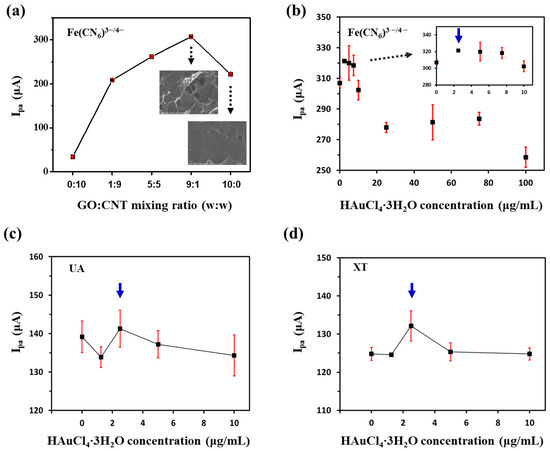Next, we examined current responses of GNP/rGO-CNT/GCE to UA and XT, respectively, according to concentrations of HAuCl4·3H2O (0, 1.25, 2.5, 5.0, 10 μg/mL). As shown in Figure 2c, Ipa of GNP/rGO-CNT/GCE to UA (100 μM) was similar at all concentrations of HAuCl4·3H2O. However, the maximum Ipa of GNP/rGO-CNT/GCE to XT (100 μM) was observed with 2.5 μg/mL of HAuCl4·3H2O (Figure 2d). Therefore, we finally selected 2.5 μg/mL of HAuCl4·3H2O as the optimum concentration for GNP/rGO-CNT/GCE.