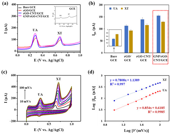 (a) Square wave voltammetry curves and (b) anodic peak current (Ipa) values of bare glassy carbon electrode (GCE), reduced graphene oxide on the GCE (rGO/GCE), reduced graphene oxide-carbon nanotube nanocomposite on the GCE (rGO-CNT/GCE), and gold nanoparticle-incorporated rGO-CNT/GCE (GNP/rGO-CNT/GCE) in PBS (0.1 M, pH 7.4) containing 25 μM uric acid (UA) and 25 μM xanthine (XT) (n = 3). Inset shows a zoomed graph for bare GCE. (c) Cyclic voltammetry curves of GNP/rGO-CNT/GCE at different scan rates (10–100 mV/s) in PBS (0.1 M, pH 7.4) containing 25 μM UA and 25 μM XT. (d) Corresponding plots of log Ipa vs. log scan rate (v) for UA and XT of GNP/rGO-CNT/GCE.