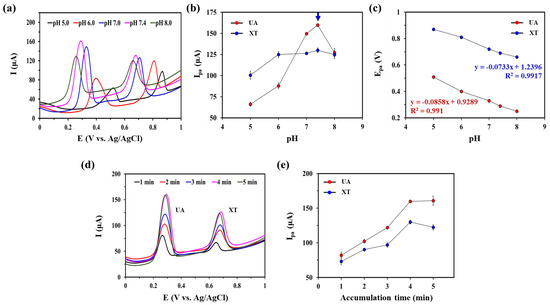 The pH of the supporting electrolyte can have a significant effect on electrochemical oxidation of XA and UA [35,36]. Therefore, we investigated the effect of pH on oxidation current responses of UA and XT at GNP/rGO-CNT/GCE by recording SWV curves from pH 5.0 to 8.0 in 0.1 M PBS containing 25 μM UA and 25 μM XT (Figure 4a). As shown in Figure 4b, the Ipa of UA increased with increasing pH up to 7.4. It then decreased at higher pH (8.0). This effect of pH on Ipa of UA might be attributed to the fact that deprotonated UA at higher pH (8.0) was inefficiently adsorbed on GNP/rGO-CNT/GCE due to electrostatic repulsion [35]. The Ipa of XT did not change in the pH range of 6.0–8.0. Therefore, we selected pH 7.4 as an optimal pH for simultaneous detection of UA and XT. Moreover, as shown in Figure 4c, Epa showed a linear relationship with pH (Epa = −0.0858 pH + 0.9289, R2 = 0.991 for UA; Epa = −0.0733 pH + 1.2396, R2 = 0.9917 for XT). Epa moved to negative potentials with an increase of pH for both UA and XA (Figure 4c), indicating that a proton transfer occurred in the oxidation reaction of UA and XT [19,26,27]. As slopes for UA (85.8 mV/pH) and XT (73.3 mV/pH) were close to the theoretical value of the Nernst equation, we inferred that the oxidation process of UA and XA was related to an equal number of protons and electrons—two protons and two electrons [21,25,36,37]. Thus, the mechanism for UA and XT oxidation can be proposed in Figure S4.