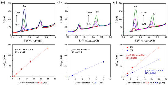 We investigated sensing performance of GNP/rGO-CNT/GCE for simultaneous detection of UA and XT. First, SWV was performed by changing the concentration of UA (0, 1.56, 3.125, 6.25, 12.5, 25.0 μM) in the presence of 12.5 μM XT. As shown in Figure 5a, the Ipa of GNP/rGO-CNT/GCE increased with an increasing UA concentration. The change in Ipa of GNP/rGO-CNT/GCE was linear with UA concentration in the range from 0 to 25.0 μM (R2 = 0.995), showing a sensitivity of 5.518 μA/μM UA. A lower detection limit was 910 nM based on the signal-to-noise ratio of three (S/N = 3). Next, changes in Ipa of GNP/rGO-CNT/GCE were analyzed by changing the concentration of XT (0, 3.125, 6.25, 12.5, 25 μM) in a mixture solution containing 6.25 μM UA. As shown in Figure 5b, the Ipa of GNP/rGO-CNT/GCE also increased with an increasing XT concentration. The change in Ipa of GNP/rGO-CNT/GCE had a linear relationship with XT concentration in the range from 0 to 25.0 μM (R2 = 0.995), with a sensitivity of 2.888 μA/μM XT and a detection limit of 2.57 μM. Finally, SWV was performed by changing concentrations of UA and XT from 0 to 25.0 μM simultaneously. As shown in Figure 5c, Ipa changed linearly depending on the concentration of UA and XT. Sensitivities for UA (5.376 μA/μM UA, R2 = 0.988) and XT (3.275 μA/μM XT, R2 = 0.9969) were similar to those of individual UA or XT. Therefore, the GNP/rGO-CNT/GCE was capable of simultaneous detection and quantitative detection by separating oxidation peaks from each other.