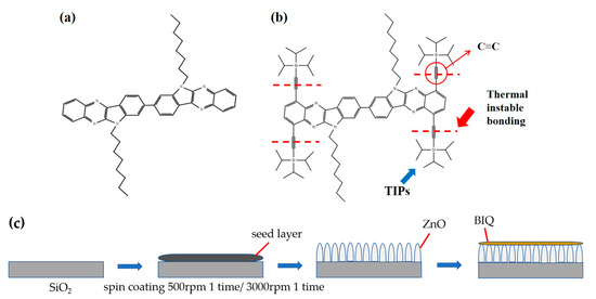 Chemical structure of (a) BIQ and (b) BIQ-TIPs. The TIPs moiety is marked by the red dashed lines. (c) The flow of the fabrication process.