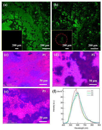 The CLSM images of (a) BIQ/SiO2 and (b) BIQ/ZnO NRs samples. The PL receiving wavelength range is from 510 to 810 nm. The subfigure in (a,b) corresponds to the CLSM image when receiving the PL wavelength with a range of 350–510 nm. The PL image of BIQ/ZnO NRs sample when (c) P1, (d) P2, and (e) P3 are in different positions. (f) The corresponding PL emission spectrum at P1–P3.