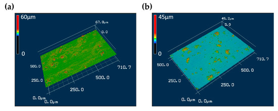 Moreover, to investigate the surface clustering effect, color 3D laser scanning microscopy was used. The color 3D images for BIQ/ZnO and BIQ/SiO2 were shown in Figure 6a,b, respectively. Compared with deposition of BIQ on the SiO2 substrate as shown in Figure 6b, deposition of BIQ on the ZnO NRs exhibited a nonuniform surface morphology, which indicated the aggregation of BIQ on pure ZnO NRs. However, the aggregation effect of BIQ on the ZnO NRs was not as strong as that of BIQ-TIP on the ZnO NRs, which may result from high solubility of BIQ-TIP induced by the four TIPs moieties.