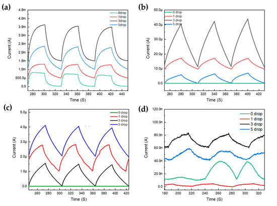 The photoresponse of ZnO NRs photodetector with various amounts of drops (0, 1, 3, and 5 drops) of BIQ solution under (a) UV, (b) white, (c) green, and (d) red LED illumination.