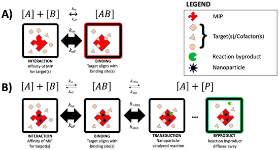 Figure 1 shows a conceptual diagram for describing a few lock-and-key models (with and without reaction) based on particulate schematics by Ullah et al. [36]. In the absence of a reaction (Figure 1A), the rate of MIP target binding is largely governed by Arrhenius behavior, pH, background salt concentration, and binding site occupancy (i.e., cooperativity). Similar to antibody–antigen systems, MIP chemosensors are often diffusion-limited, and systems that are based in multitopic interaction (homobivalent or heterobivalent) may have considerable cooperativity. The signal in such an MIP system (highlighted with a red halo in panel A) is a direct result of target binding and is proportional to the global binding constant (KD). In nanoparticle–MIP ligand systems (Figure 1B), the conceptual idea is that local proximity between the template and doped nanoparticle(s) creates a catalytic site, similar to enzymes. The formation of a target–MIP complex (AB) occurs at the template site, governed by the same principles as non-reactive MIP systems. Using the example of Michaelis–Menten kinetics as a model, a nanoparticle-catalyzed reaction near the template site produces a reaction byproduct (P) which diffuses away and leaves the template site vacant for a subsequent binding/reaction sequence. During the initial interaction, the reverse reaction rate (k-Rxn) is shown for thoroughness, which is thermodynamically possible (particularly in complex media). The overall process is affected by the presence of inhibitors, or insufficient activators (i.e., nanoparticles in proximity of template sites). As discussed by Ullah et al. [36], many other kinetic models exist for describing affinity-based sensors, but the examples below remain the core mathematical models for understanding MIP and nano-MIP systems.