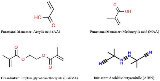 There are numerous established approaches in the available literature by which MIPs are generally synthesized. Some of the notable concepts of producing MIPs include (1) soft lithography techniques, (2) chemical synthesis employing functional monomers and template molecules, and (3) employing a phase inversion technique of precipitating a polymer with an insoluble additive [34]. Among the listed concepts of producing MIPs, the most widely used approach is the chemical synthesis method which is comprised of functional monomers interacting covalently or non-covalently with template molecules to form a complex molecule. Some examples of frequently used MIP functional monomers are acid-based compounds such as methacrylic acid (MAA) and itaconic acid, and some neutral pH compounds such as acrylamide [34,47]. The vital role of the functional monomer is to provide hydrogen bonding or as a reactive species to form a covalent interaction with the template molecule [34]. The formation of the functional monomer–template molecule complex is then supported by the action of a cross-linker compound, and one typically used is ethylene glycol dimethacrylate (EGDMA). For effective polymerization to occur, an initiator and an organic compound are required. For example, azobisisobutyronitrile (AIBN) may be mixed, and polymerization takes effect in the presence of heat or ultraviolet radiation [38]. The polymerization process terminates by producing a powdered substance (MIP) in most cases, which could be employed for an array of applications after the removal of the template molecule by the Soxhlet extraction method which ensures the activation of the binding sites or cavities of the MIP [34,38,47,48]. Some of the commonly used organic compounds employed for MIP synthesis have been outlined (Figure 3).