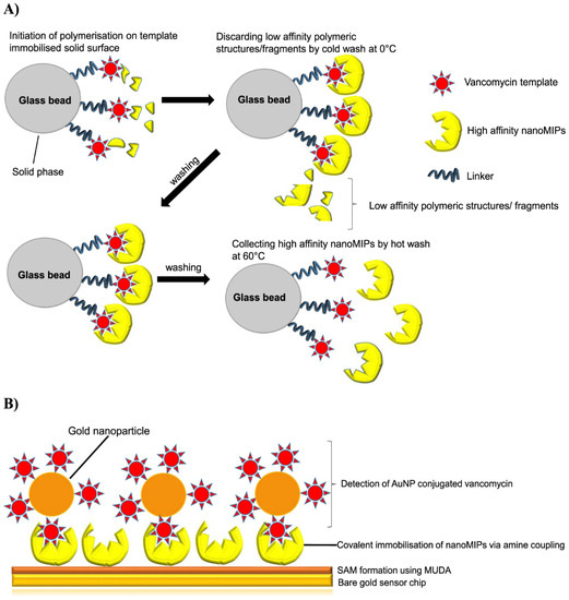 Generally, an MIP chemosensor based on SPR has an integration of silver or gold nanocomposites coupled to it, which eventually relays a variation in refractive index and electron density at the MIP’s surface upon binding of the target analyte to the MIP [15,38].