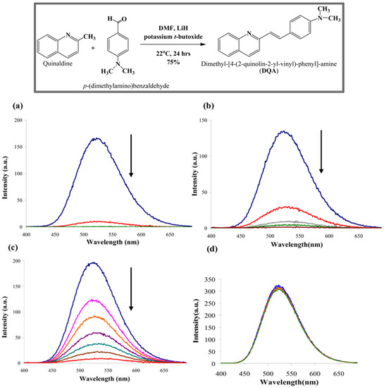 A schematic illustration of the synthesis of dimethyl-[4-(2-quinolin-2-yl-vinyl)-phenyl]-amine (DQA), an azastilbene chemosensor used for the evaluation of four different organophosphate pesticides in our laboratory. The fluorescence emissions spectra of DQA upon binding to four different OPPs (ethion, malathion, parathion and fenthion). (a) Titration with ethion; from top to bottom, concentration of ethion = 0, 2, 4, 6 µM; (b) titration with malathion; from top to bottom, concentration of malathion = 0, 2, 4, 8 µM; (c) titration with parathion; from top to bottom, concentration of parathion = 0, 2, 4, 6, 8, 10, 12 µM; and (d) titration with fenthion, with up to 24 µM of fenthion added, no change was observed. The direction of the arrow indicates the transformation in intensity of fluorescence [18].