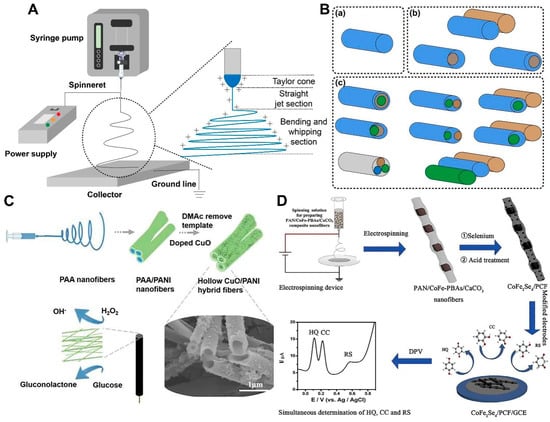 Multifluid electrospinning technology is also increasingly used in various fields. Yang et al. demonstrated a preparation of functional three-layer NFs by using tertiary coaxial electrospinning []. The NFs utilized cellulose acetate (CA) and polyvinylpyrrolidone (PVP) as drug carriers, and the middle blank CA layer enabled precise two-stage drug release. While the development of tertiary structures is still in its early stages, research is exploring the combination of coaxial and Janus structures to form three-level structures with diversified parallel coaxial and coaxial parallel arrangements [,,,,,]. Generally, hollow NFs need to be obtained under an inert atmosphere or after freeze-drying [,,]. However, the development of coaxial electrospinning technology has enabled the one-step preparation of hollow NFs. The principle of preparing hollow NFs is similar to that of solid NFs, but the spinning parameters and post-treatment need to be adjusted. Irfan et al. used a coaxial double capillary filament head with PVP as the sheath fluid and a salt solution as the core fluid to prepare hollow NFs through selective calcination []. By controlling the experimental parameters, the inner diameter and wall thickness of these hollow NFs can range from tens of nanometers to hundreds of nanometers, and the core and sheath fluids can be modified independently to achieve NF functionalization [,,,]. Liu et al. made hollow NFs composed of copper oxide (CuO) and polyaniline (PANI) []. The electrospinning technique was employed to fabricate hybrid NFs, which demonstrated outstanding electrochemical characteristics in detecting hydrogen peroxide (H2O2) and glucose without the need for enzymes. The hollow NFs possess several noteworthy attributes, including their considerable surface area, high porosity, and distinctive structure, rendering them a suitable choice for sensing materials. Notably, the hollow configuration of the NFs facilitates the diffusion of analyte molecules into the nanofiber, thereby enhancing the sensitivity and selectivity of H2O2 and glucose detection (Figure 2C). The resulting hollow structure of these fibers increases their surface area and capacitance. Conductive nanoparticles are added to enhance their electrochemical performance through reversible redox reactions. The supercapacitors fabricated using these fibers show excellent properties, making them potential candidates for future energy storage systems. Yin et al. prepared cobalt–iron selenides (CoFe2Se4) porous carbon NFs (PCF), using Prussian blue analogues, as a novel phenolic chemosensor for detecting gases []. The nanocomposites produced through the use of three-dimensional (3D) network nanostructures offer an optimal conductive network that promotes electron transfer and inhibits the aggregation of nanoparticles. By utilizing porous NF-modified electrodes, hydroquinone (HQ), catechol (CC), and resorcinol (RS) were simultaneously detected with excellent electrochemical performance and multiplexing ability. The porous structure and high conductivity of the NFs make them an ideal support material for chemosensors, resulting in a synergistic effect that enhances electrocatalytic performance (Figure 2D). The porous NF-based sensors obtained have a good anti-interference performance and excellent stability. When the structure of NFs is changed from solid to porous, the fiber specific surface area can be increased, and increasing the surface area is conducive to the application of NFs to the fields of catalysis, filtration, adsorption, tissue engineering, and other fields [,,,,,]. There are three ways to achieve porous structures in electrospun NFs, breath figures (BFs), based on selective removal of components (SR) from NFs made from composites or blended materials and the use of phase-separation methods []. Poudel et al. prepared three-dimensional hollow and porous carbon NFs (3DHPCNF) by coaxial electrospinning and freeze-drying and then prepared ZMA-LDH@Fe2O3/3DPHCNF (ZMA-LDH, ternary zinc–magnesium–aluminum layered double hydroxide) by hydrothermal synthesis double hydroxide and α-Fe2O3, hematite) [].