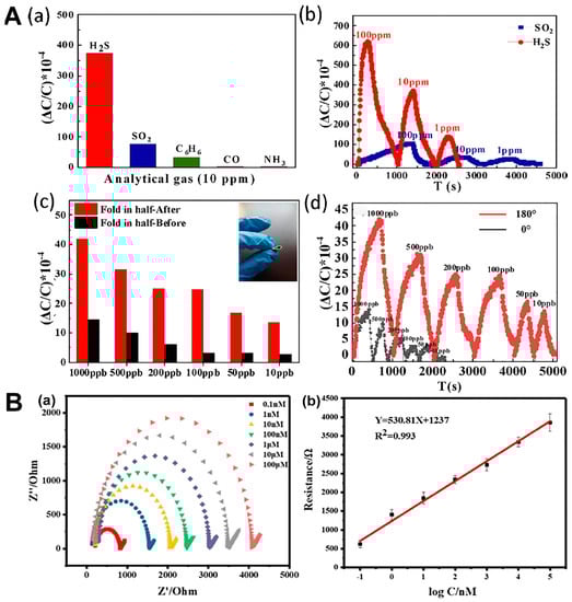 Application of electrochemical detection sensors in environmental pollution. (A) (a) Evaluation of the selectivity of the NO2-UiO-66 nanomaterial sensor toward H2S. (b) Detection of varying concentrations of H2S and SO2, using the NO2-UiO-66 nanomaterial sensor. (c) Analysis of the capacitive variations exhibited by the sensor under normal conditions and when subjected to 180° bending. (d) Investigation of the cyclic stability of the sensor for different concentrations of H2S while subjected to bending (reproduced with permission from [], copyright © 2022, Elsevier). (B) (a) Investigation of the impedance responses of the aptasensor toward various concentrations of TC, using EIS. (b) Generation of a calibration curve for the quantitative detection of TC, using the aptasensor (reproduced with permission from [], copyright © 2022, Elsevier).