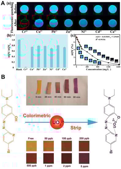 Application of optical detection sensors in environmental pollution. (A) (a) After adding different metal ions at a concentration of 2000 mg/L, the lignin-based hydrogel exhibited changes in its fluorescent properties. (b) The addition of various heavy metals caused the AQY (absolute quantum yield) of FLH-3, a hydrogel made from lignin, to vary. (c) The concentration of Cr(VI) had a gradual effect on the fluorescence of FLH-3, resulting in a decrease over time (reproduced with permission from [], copyright © 2021, Elsevier). (B) The process of complex formation with uranyl ions, the duration required for colorimetric detection in photographs, and the optical colorimetric response of Br-PADAP/CA NFs at varying concentrations of UO22+ (reproduced with permission from [], copyright © 2017, Elsevier).