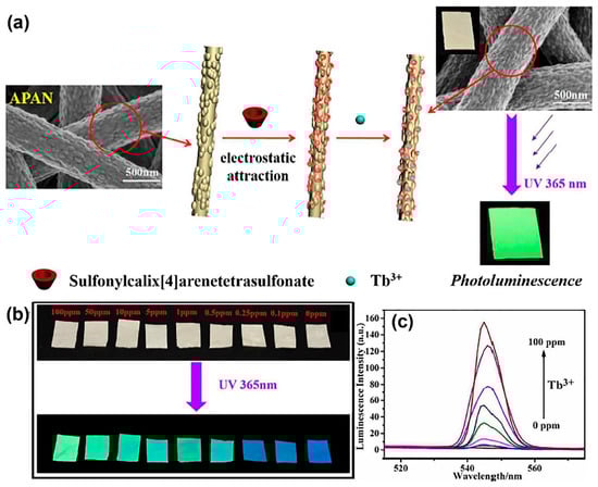 Electrospun-NFs-based chemosensors for water pollutant. (a) Preparation procedure and photoluminescent behavior of sulfonylcalix[4]arene-functionalized APAN nanofibrous for the adsorptive removal Tb3+ ions. (b) Photographs of NFs after immersing into Tb3+ aqueous solutions (0–100 ppm). (c) Fluorescence spectra of NFs (reproduced with permission from [], copyright © 2018, Royal Society of Chemistry).