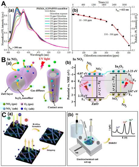 Electrospun-NFs-based chemosensors for gas pollutant. (A) PL spectra. (a) PMMA_0.25%PFO NF exposition to chloroform vapor; it was excited at 390 nm. (b) The dependence of the emission intensity as function of chloroform concentration for PMMA_0.25%PFO NF (monitored at 420 nm) (reproduced with permission from [], copyright © 2017, Wiley Periodicals). (B) Schematic diagrams of (a) NO2 detection process, (b) In2O3/ZnO heterojunctions, and corresponding energy band diagram (reproduced with permission from [], copyright © 2021, Elsevier). (C) The PEDOT/PVA/AgNPs-fibers-modified SPCE preparation. (a) Bi-alloy formation on electrode surface, followed by stripping. (b) Electrochemical detection of heavy metal ions via SWASV (reproduced with permission from [], copyright © 2022, Elsevier).