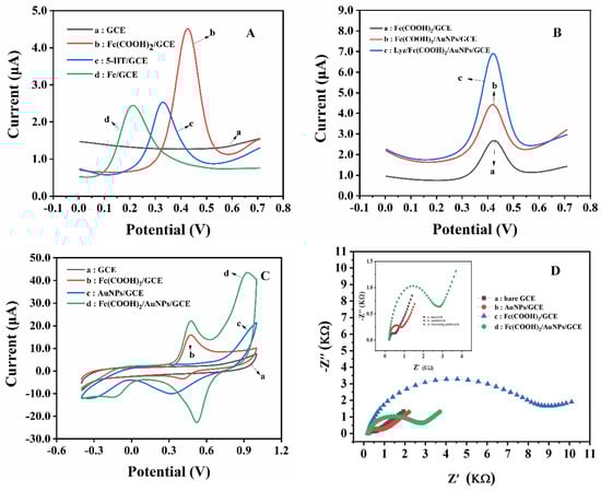 Next, various modified electrodes were investigated by EIS, as shown in Figure 1D, where all charge transfer impedances were fitted according to the existing semicircles [41]. The impedance results of EIS is obtained by EIS simulation based on Randles equivalent circuit [42]. The electrochemical independences of every surfaces are arranged in increasing order: Fc(COOH)2/GCE (8048.0 Ω) > Fc(COOH)2/AuNPs/GCE (2521.0 Ω) > AuNPs/GCE (748.0 Ω) > GCE (385.0 Ω). As expected, AuNPs decreased the electrochemical independence once deposited as an amplifier unit of the designed sensor. All these results proved the feasibility of the developed Fc(COOH)2/AuNPs/GCE for Lyz determination.