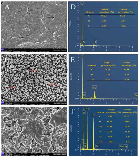 To characterize the proposed sensor, AuNPs and Fc(COOH)2 were deposited on SPCE (Φ = 0.3 cm). Then, the morphology and element distribution of the different modified electrodes were separately studied by SEM and EDS. As can be seen in Figure 2A,D, the rough surface of SPCE is mainly composed of C without any interfering substance attached. The presence of S is attributed to the activation of the SPCE by sulfuric acid before use Figure 2B,E show that dense spherical AuNPs of different sizes, such as the particle size of AuNPs: 94.44 nm, 144.00 nm, and 241.37 nm, were successfully electrodeposited on the electrode surface, which enlarged the surface available for adsorption of Fc(COOH)2, so that the detected current signal was increased greatly. Figure 2C shows that a 3D porous frame was formed by the polymerization of Fc(COOH)2 molecules, providing considerable active sites for binding. The corresponding EDS result shown in Figure 2F indicated the rising mass fraction of Fe.