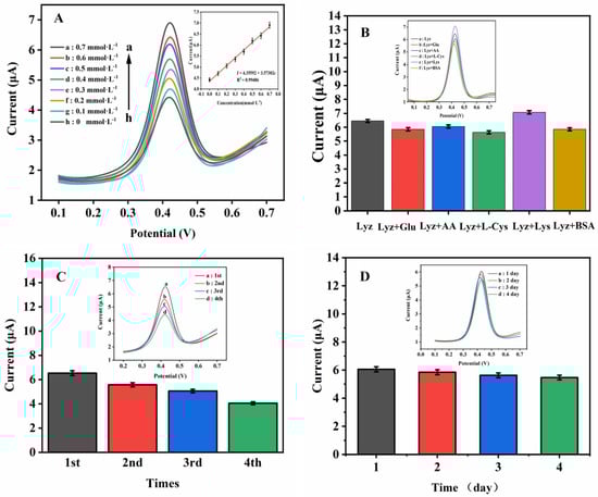 (A) DPVs of Lyz at different concentrations (h–a: 0, 0.1, 0.2, 0.3, 0.4, 0.5, 0.6, and 0.7 mmol·L−1, respectively) under optimal conditions, insert: calibration plot in various concentrations of Lyz at Fc(COOH)2/AuNPs/GCE. The study of selectivity (B), repeatability (C), and stability (D) of the Fc(COOH)2/AuNPs/GCE for Lyz detection under optimal conditions.