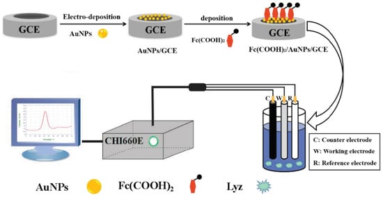In recent years, increased attention have be confined to the development of various electrochemical sensors due to their advantages of fast response, high sensitivity, low cost, simple analysis, and real-time [19,20,21,22,23]. They have performed an important role in food safety testing [24,25]. Most of the existing papers focus on the development of electrochemical aptasensors for Lyz detection [26], the few sensors are using no bioreceptors [18]. As a promising material, gold nanoparticles (AuNPs) have received extensive attention in recent years for their wide applications in electronics, catalysis, and biosensors [27,28,29], due to their large aspect ratio, good biocompatibility, and high electrical conductivity [30,31]. Moreover, ferrocene (Fc, known as dicyclopentadienyl iron) and its conjugates, such as ferrocene carboxylic acid (Fc(COOH)) and ferrocene dicarboxylic acid (Fc(COOH)2) [32,33,34], are widely used in the field of electrochemical sensors [35], acting as a redox mediator with stable structure, easy modification, good reactivity, and reversible single-electron redox pair [36,37].
