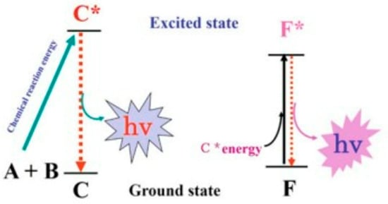 The production of electromagnetic radiation through a chemical reaction is called chemiluminescence (CL) [1,2]. In other words, in CL, an electrically stimulated chemical species emits light [3,4]. For example, reactants A and B, upon reaction, generate an electrically excited state, C*, which emits radiations upon returning to its ground state (Figure 1) [4]. The intensity of CL is determined by the rate of the reaction as well as the ratio of the number of luminescent molecules to the number of molecules reacting (CL quantum efficiency). The majority of CL reactions emit minimal light and hence have a lower quantum efficiency. To address the issue, sensitizers, chemicals with a high fluorescence efficiency, are added to the CL reaction. An energy transfer from C* to the sensitizer with a high fluorescence efficiency occurs, resulting in high emission [3]. The formed free radicals in CL produce unstable intermediates in the excited state, which either de-excite to the ground state accompanied by the emission of light or transfer energy to other luminophores. Normally, the energy produced by CL is more than 45 kcal/mol [5]. CL’s advantages include high sensitivity, low cost, simplicity [5], low background noise [6], simple instrumentation, ease of automation [1], wide dynamic range and low detection limits. These factors influenced the interest in CL detection for flow injection analysis (FIA), high-performance liquid chromatography (HPLC), including miniature systems, and, more recently, the rapidly expanding field of capillary electrophoresis [7] as well as in the microfluidic systems.