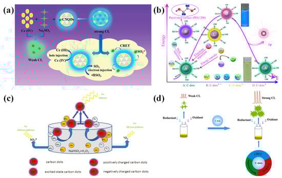 Zhou et al. employed CDs to improve the CL intensity of peroxomonosulphate and the sulfite reaction in an acidic reaction [6]. The improvement was noted to stem from the energy transfer and electron transfer annihilation effect of CDs. The produced radicals were found to react with the CDs to inject holes and electrons in the CDs. The electron-transfer annihilation process of the positively and negatively charged CDs results in excited CDs*. On the other hand, the excited SO2* gave energy to the CDs. The final emission was from the CDs* (Figure 2b). The CL of the aforementioned system was found to be inhibited by the aliphatic amines. The sensitized CL system was expended for the determination of aliphatic amines in water samples in a linear range from 1 × 10−5 to 1 × 10−9 mol/L. The CDs were used as enhancers for the bisulfite-H2O2 CL system [31]. The detailed mechanism of enhancement is elaborated in Figure 2c. The free radicals generated in the system were found responsible for generating holes in the valence band and electrons in the conduction band of the CDs. The electron annihilation effect was responsible for the generation of the excited states of the CDs, a reason for the enhanced CL. Li et al. used CDs and sulfite for the generation of CL signals [66]. The proposed CL method was used for the determination of bromate in water samples. A redox interaction between the CQDs, bromate, and sulfite in the acidic media caused the excitation of CDs due to electron and hole injection in the conduction and valence bands of CDs. Bromate is toxic to humans and other biotic components of the environment. The addition of bromate further enhanced the intensity of CL and was found to linearly increase with the increase in bromate concentrations. The given method was used for the determination of bromate in drinking water. The mechanism of the CDs-enhanced CL systems were recently reviewed in detail (Figure 2d) [50].
