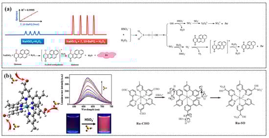 (a) Mechanism of enhancement and determination of 7,10-BaPQ in NaHSO3-H2O2 system. Reprinted with permission from [30], copyright 2012, American Chemical Society. (b) The CL enhancement mechanism of Ru (II) complex with hydrogen sulfite. Reprinted with permission from [82], copyright 2018, Elsevier.