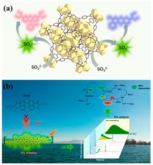 Sun et al. created a CL probe, APDI (N′N′-di(propylethylenediamine)-perylene-3,4,9,10-tetracarboxylic diimide), to detect the ●OH radical among a variety of other radicals [17]. The Fenton system was used to generate the ●OH radical. The sulfite was used as a reducing agent for the conversion of Fe3+ to Fe2+ ions in the system. The APDI was used to specifically detect the generated ●OH radicals in the system. The generated radicals in the system were used for the degradation of bisphenol A, as a contaminant, through AOPs in environmental samples (Figure 6b).