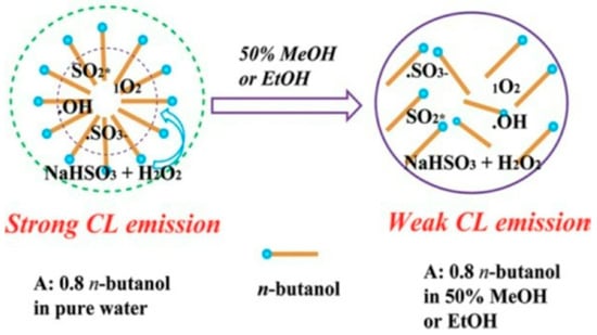 Li et al. used alcoholic solvents to enhance the weak CL from the sulfite-H2O2 system [54]. They enhanced the CL intensity by using alcoholic solvents with two to five carbon atoms. The n-butanol is the most suitable carbon for carbon cage formation, and among the used alcohols, it results in the highest CL intensity (Figure 7). The alcoholic solvent forms the solvent cage, somewhat similar to micelles in water. The CL-enhancing effect was attributed to the following three main reasons; (i) the solubilization effect of the micellar system, (ii) the concentration of the CL reagents at the micellar system due to the electrostatic effects, and (iii) the micellar system circumvents the quenching of emitting species and protects the radicals.