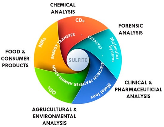 As said earlier, for sulfite detection of complex materials, designing a CL sensing platform with high sensitivity and selectivity is crucial [77]. In food safety, environmental monitoring, medical diagnostics, and public health assurance sectors, there is an urgent demand for rapid on-site detection with high sensitivity and specificity [110]. One such system is the detection of H2O2 [111] in environmental samples using sulfite-amplified CL [112]. The different reagents determined in various samples by the sulfite-based CL systems are summarized in Table 1 and are under discussion in the following sections.