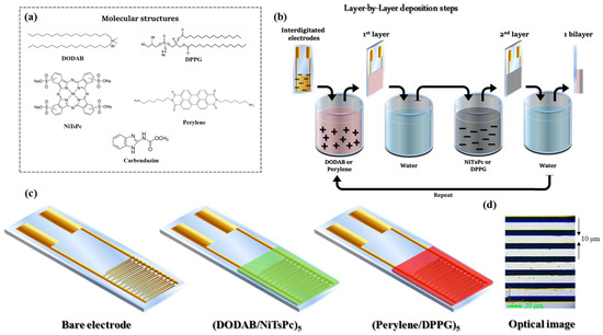 (a) Molecular structures of DODAB, DPPG, NiTsPc, Perylene and MBC. (b) Layer-by-layer deposition steps. (c) Sensing units composed by bare IDE and IDEs covered with LbL films of (DODAB/NiTsPc)5 and (Perylene/DPPG)5. (d) Optical image of the IDE 10 showing the space of 10 μm between electrodes.