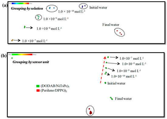 The best performance was achieved when the sensing units are analyzed separately. The sensing unit covered with DODAB/NiTsPc LbL film was able to discriminate the MBC concentrations while the sensing unit recovered with Perylene/DPPG remains unable to discriminate in the grouping by sensing unit plot (Figure 3b). Moreover, it is possible to observe a pattern from the lower to higher MBC concentrations. The separation of initial and final water shows the irreversibility of measures. This phenomenon is reported in the literature [38] and may be related to adsorption of analyte, which can lead to irreversible changes. In our case, the last layer of the DODAB/NiTsPc LbL films was DODAB, and for Perylene/DPPG LbL films the last layer was DPPG. Thus, we can relate the better response of the sensing units covered with DODAB/NiTsPc to the interaction between DODAB and MBC. Indeed, our group reported the affinity between DODAB and MBC by Langmuir isotherms. The interaction is driven by ion-dipole forces between the benzimidazole moiety and quaternary N+, from MBC and DODAB respectively [41]. The absence of interaction between DPPG and MBC was attained to steric hindrance.