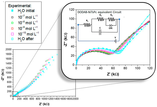 Cole-Cole plot (−Z″–Z′) of the (DODAB/NiTsPc)5 sample immersed in: water initial, MBC dissolved in water at concentrations from 1.0 × 10−10, to 1.0 × 10−7 mol L−1, and water final. The zoom shows the flattened semicircular region with a fitting (continuous lines) using equivalent circuit presented in the inset. IDE 10.