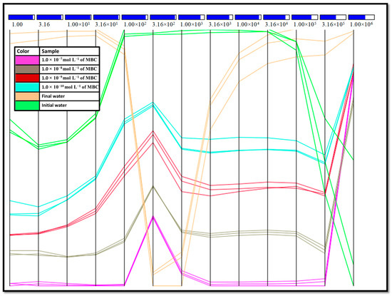 A computational analysis by parallel coordinates (PC) [27,59,60] was performed using σac data to investigate the role of frequency in the sensing unit covered by the(DODAB/NiTsPc)5 LbL film (Figure 7). This method divides the σac spectrum into a set of frequency bands represented by equally spaced vertical lines, in which each sample datum is represented as a line that intersects each column in its value at the corresponding frequency [59]. Moreover, for each frequency, a silhouette coefficient (Sc) box shows the contribution of the dimension related to its distinction capability, i.e., it is a metric of quality of data. Sc values vary between –1 and 1 and is represented in a color scale, blue being the highest contribution for the discrimination of the sample in the related frequency and the red being the smallest contribution. The magnitude of contribution is represented by the fill of the box, i.e., the greater filled, the higher (blue color) or the smaller (red color) contribution [59,60]. In general, all the frequencies contributed to the discrimination of MBC concentrations and initial and final water, being that the frequency interval from1.00 × 101 Hz to 3.16 × 101 Hz the best data discrimination. However, at this frequency region, the initial and final water are also discriminated, indicating residues in the electrical properties. Regarding the presence of MBC, there is a similarity in the profile for all the pesticide concentrations, being it equidistant in almost all frequencies. Moreover, the lines are close to each other in the three repetitions, indicating a good degree of similarity in the measurement. It is interesting to note that, at high frequencies (<3.16 × 105 Hz), the lines start to overlap, suggesting that at higher frequencies the electrical response was similar, independent of the MBC concentration.