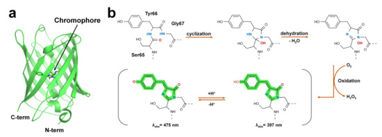 Structure of green fluorescent protein and chromophore. (a) Crystal structure of the green fluorescent protein (GFP) from jellyfish (PDB code: 1EMA). (b) GFP chromophore formation following a three-step autocatalytic process including cyclization, dehydration, and oxidation of three amino acids (Ser65, Tyr66, Gly67). Absorption properties of GFP are dependent on chromophore protonation states resulting in two absorption maxima in the excitation spectrum (the image concept was inspired from [37] and modified).