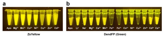 Visualization of quenchable metal ion screening for fluorescent proteins. Fluoresce quenching of (a) ZsYellow and (b) DendFP by metal ions. Original figures were obtained from previous studies for ZsYellow [92] and DendFP [93].