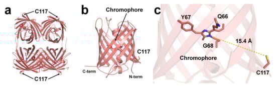 To understand the Cu2+-binding site of DsRed, the deposited crystal structure of DsRed (PDB code 1GGX) was analyzed. The Cys117 residue, which can bind Cu2+ of DsRed, was located on the β7-strand of the β-can surface (Figure 3a,b). The closest distance between the sulfhydryl of Cys117 and the imidazolinone ring of the chromophore was approximately 15.4 Å (Figure 3c). Because the DsRed monomer contains only one cysteine residue, the tetrameric DsRed can bind four Cu2+ ions (Figure 3a). Moreover, as Cys117 of DsRed was located on the surface of β-can, the chelator can easily remove the Cu2+ bound to Cys117, which is consistent with the previous spectral results [97].
